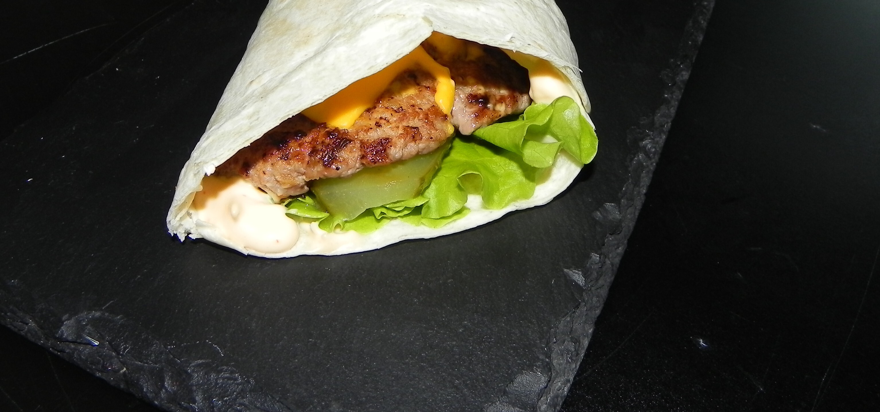 тортилья пшеничная, соус для бургеров, лист салата, котлета мясная, огурец марин., сыр