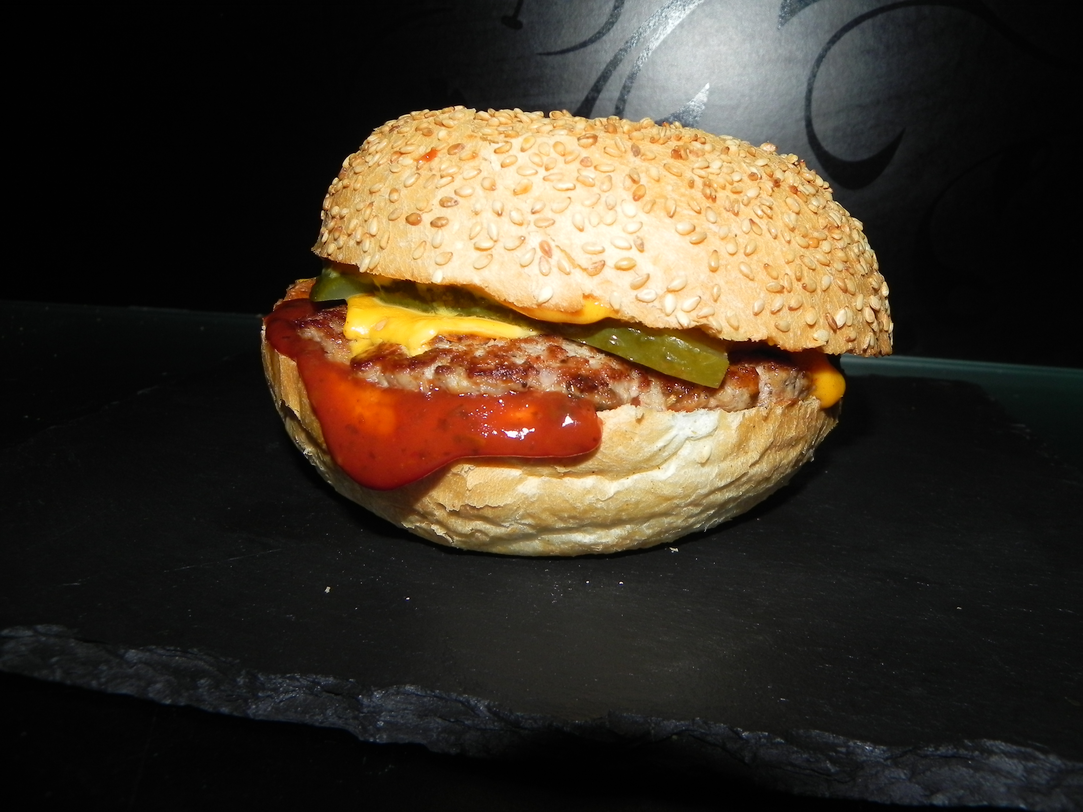 булочка с кунжутом, котлета мясная, сыр плавленный, огурец маринованный, кетчуп, соус для бургера
