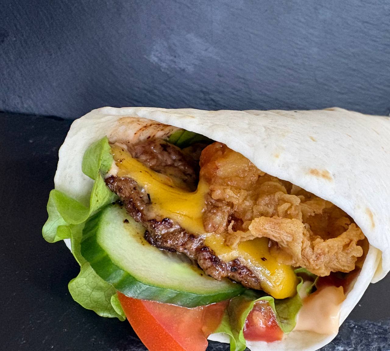 Котлета + куриный стрипс в одной тортилье. Свежие овощи, сыр Чеддер и два соуса.