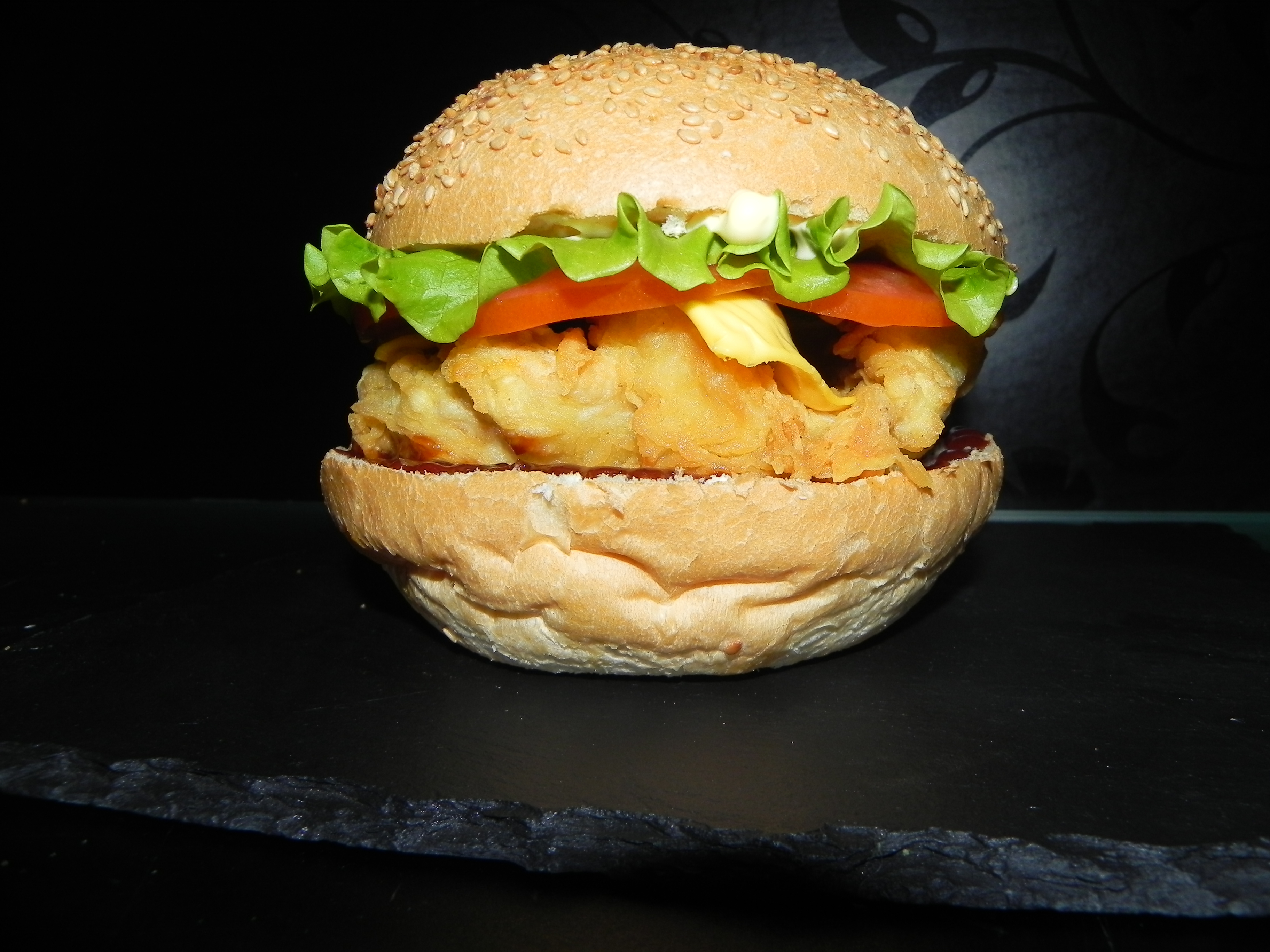 булочка с кунжутом, куриный стрипс, помидор, плавленный сыр, лист салата, соус сырный, соус барбекю