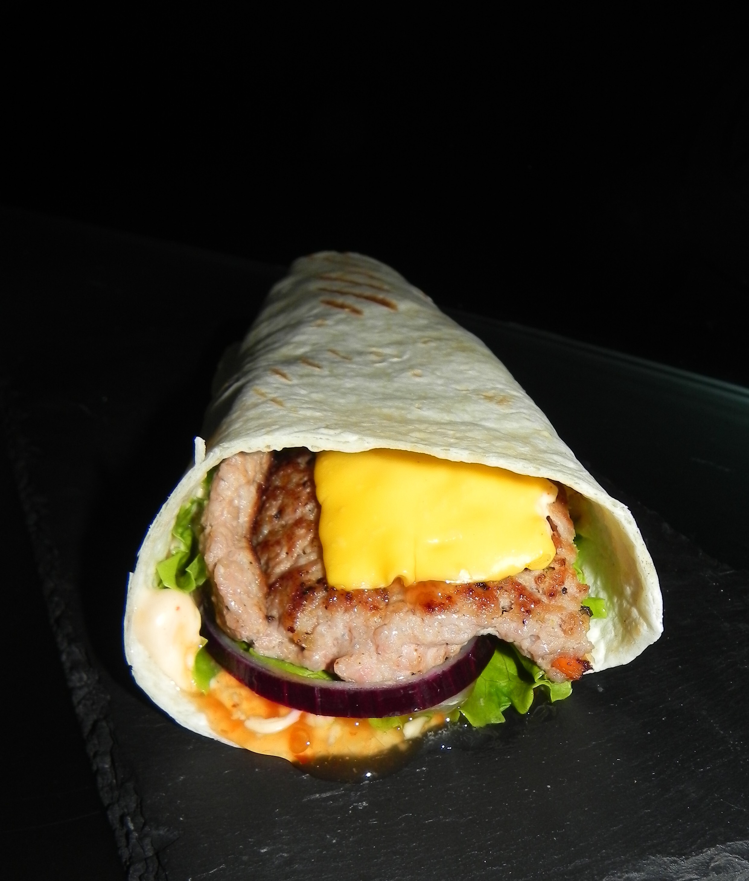 тортилья пшеничная, соус для бургеров, соус чили сладкий,огурец марин., лист салата, котлета мясная, сыр, перчик халапеньо, лук маринованный