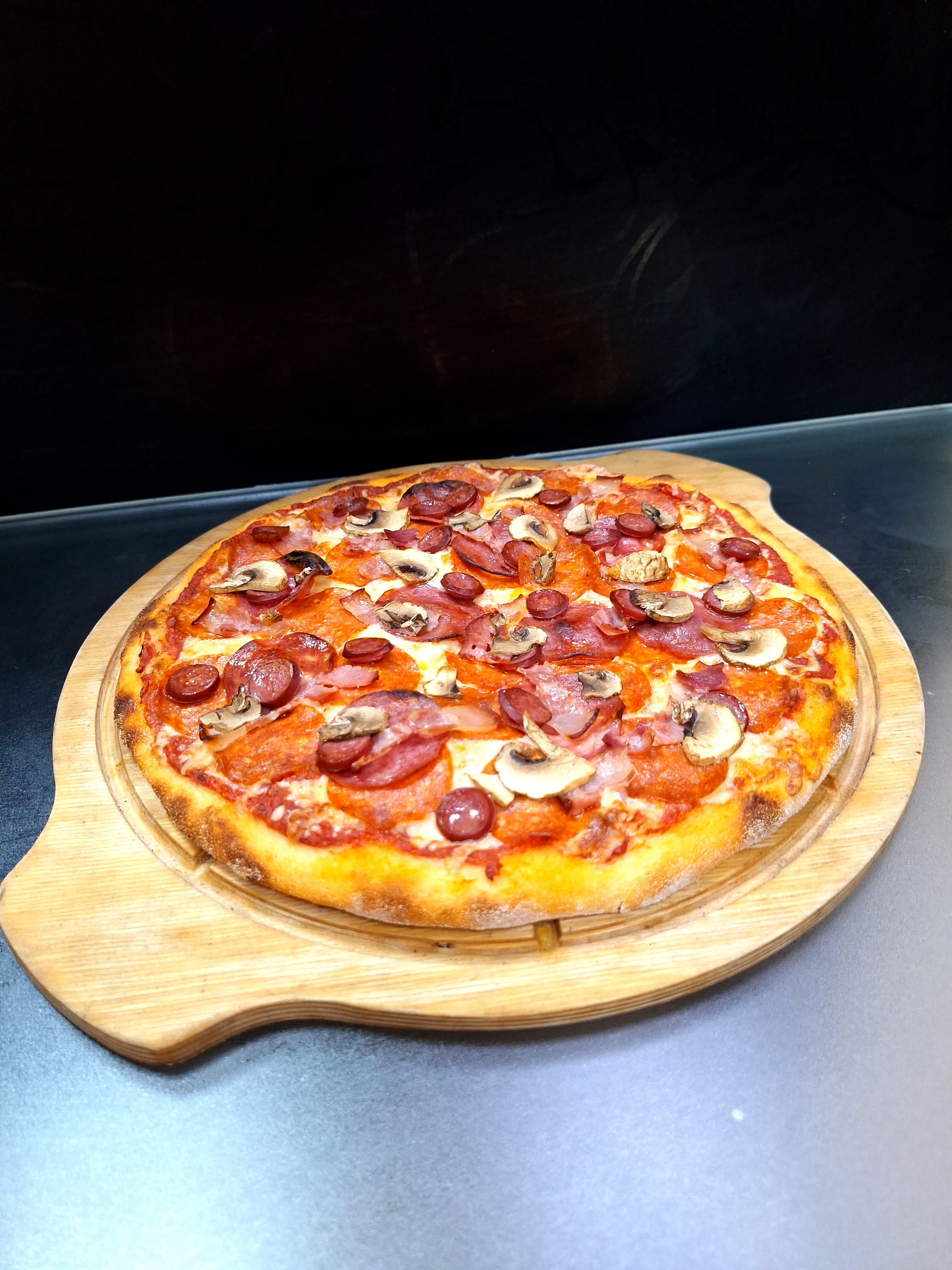 соус томатный, сыр моцарелла , пепперони, ветчина, колбаска охотничья, бекон, шампионы