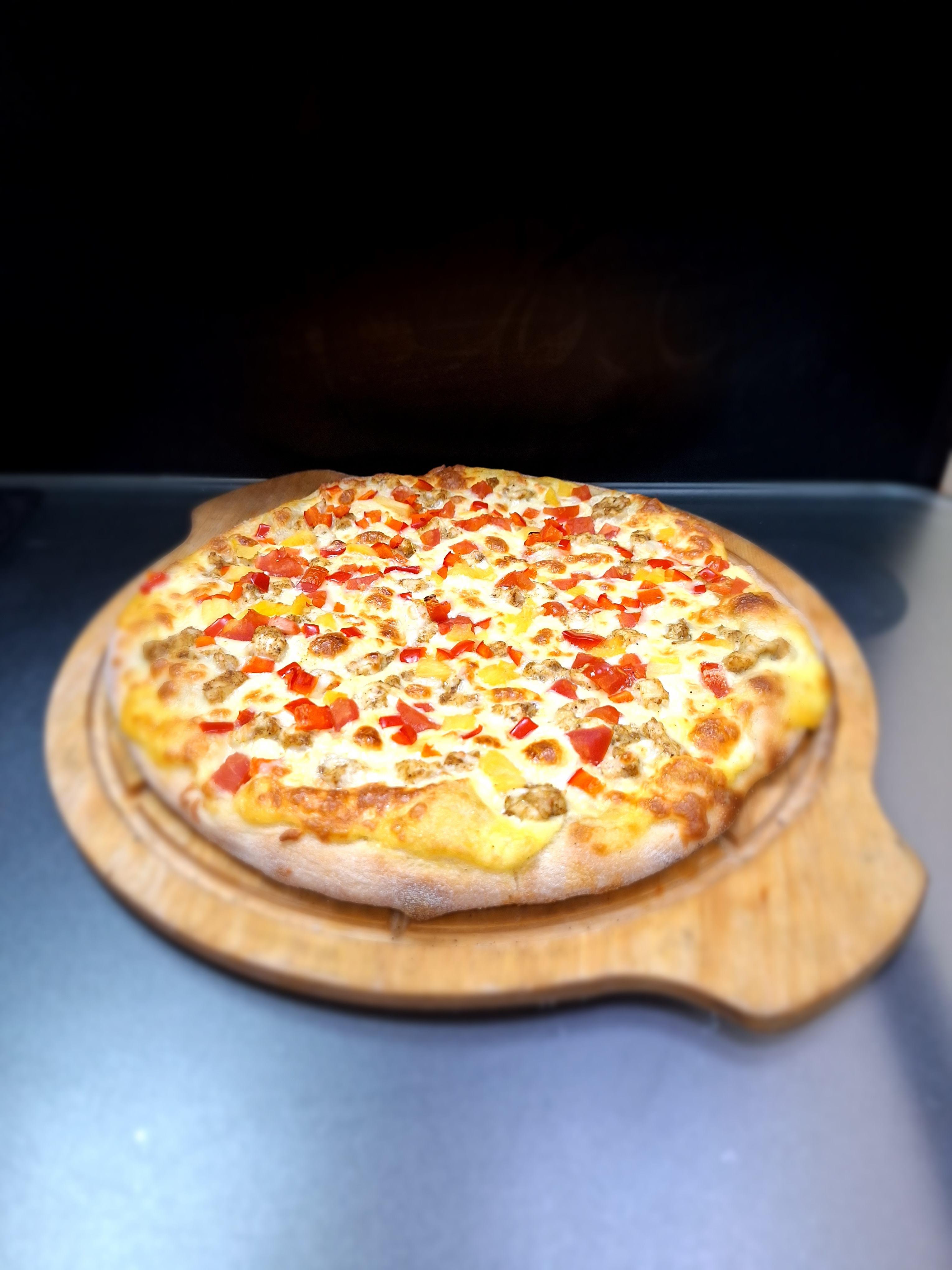 ...о, как же это вкусно! Представьте себе: тончайшее тесто, нежно хрустящее по краям; а сверху – бархатистая курочка, таящая во рту, душистый сыр, дарящий уютное тепло, сладковатый болгарский перец, томаты с садовым ароматом и кусочки спелого ананаса, добавляющие неожиданный, но такой чарующий штрих! Каждый кусочек приносит море наслаждения и улыбку на лице.